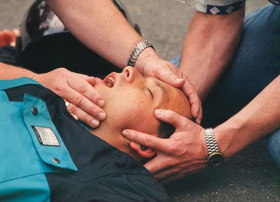 Dazu stützt er mit zwei Händen den Kopf-/Nackenbereich des Betroffenen von unten in Längsachse.